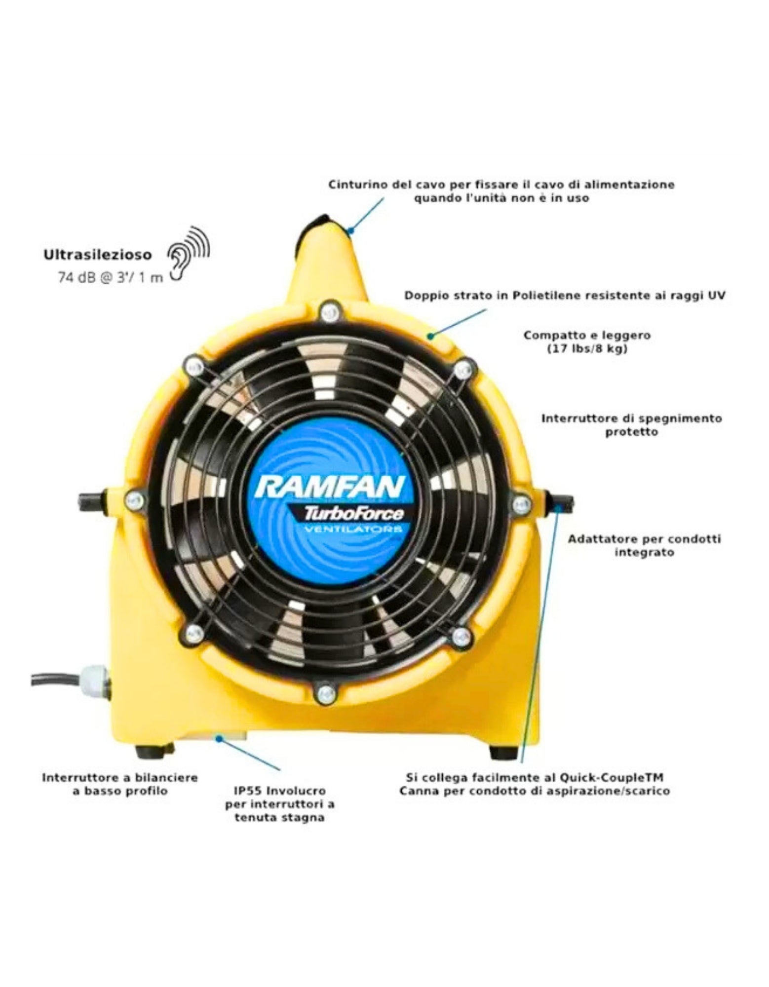 - Ventilatore assiale da 20 cm: Design compatto e maneggevole per un’installazione rapida.